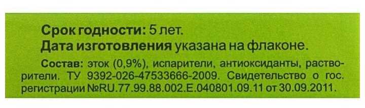 | Состав : | эток 0.9%, испарители, антиоксиданты, растворители |