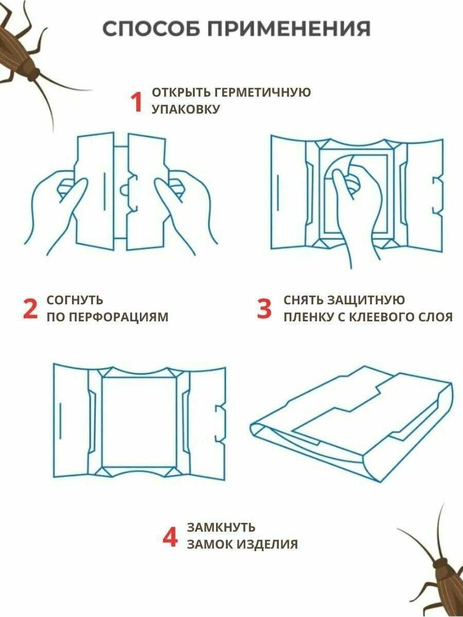 Способ применения : | Способ применения: аккуратно открыть ловушку и отделить бумагу, закрывающую клей. С помощью клапана для фиксации сомкнуть замок. Установить ловушку вблизи от стен. Для достижения лучшего результата рекомендуется использовать несколько ловушек одновременно. Для своевременной утилизации ежедневно осматривайте ловушки. |