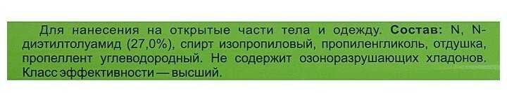| Состав : | N, N-диэтилтолуамид (27, 0%), спирт изопропиловый, пропиленгликоль, отдушка, пропеллент углеводородный |