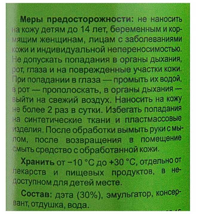| Состав : | дэта (30%), эмульгатор, консервант, отдушка, вода |