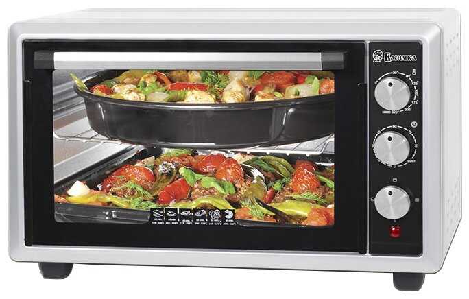 - + Небольшая по габаритам, но вполне справляющаяся со своими обязанностями. Бюджетная. Реле времени отключает печь после истечения заданного времени.