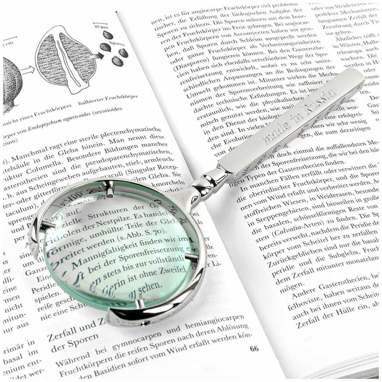 - + Лупа хороша :) Особенно понравился винтажный дизайн! Сделана качественно. Шестикратное увеличение достаточно для моих целей.