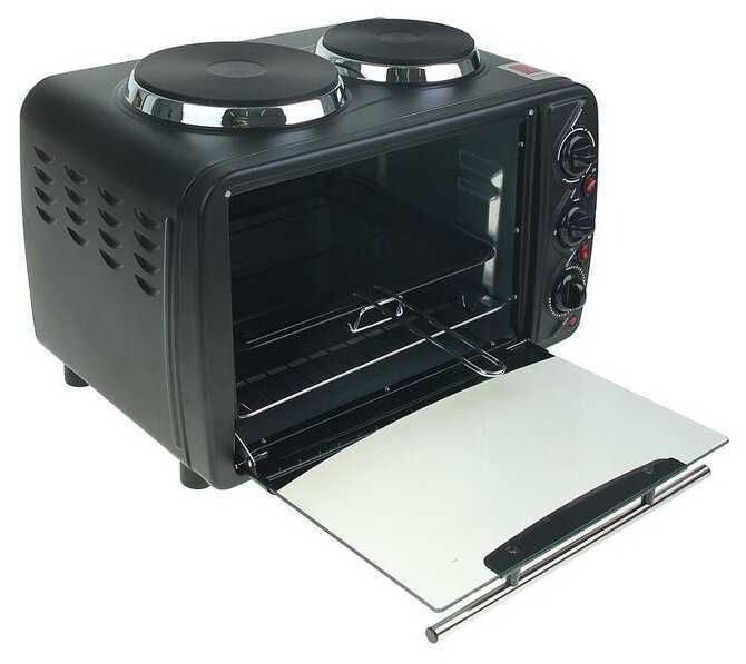 - - Маленький размер самой печи. Некрасивый черный цвет. Нет регулировки мощности конфорок и они не работают без таймера. Дорого для такой простой печи. У духовки маленькая мощность.