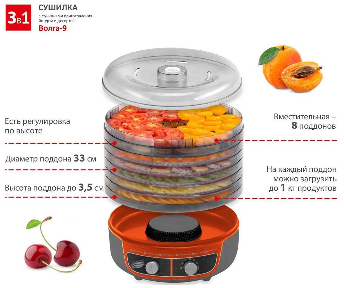 Данную сушилку выбрали на основе отзывов. Покупкой остались очень довольны, уже засушили грушу. Эта сушилка позволяет быстро и легко сушить овощи, фрукты, ягоды, грибы и другие продукты. Сушилка Волга-9 поможет справиться с урожаем и запастись витаминами на всю зиму. Рекомендую!