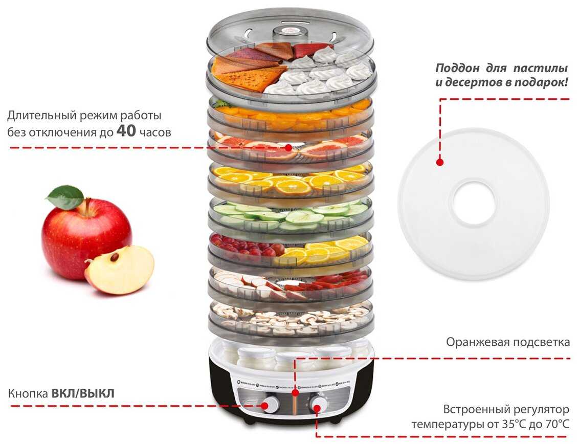 - Прозрачный пластик поддонов не деформируется при длительной сушке (например, 24 часа для абрикосов).
