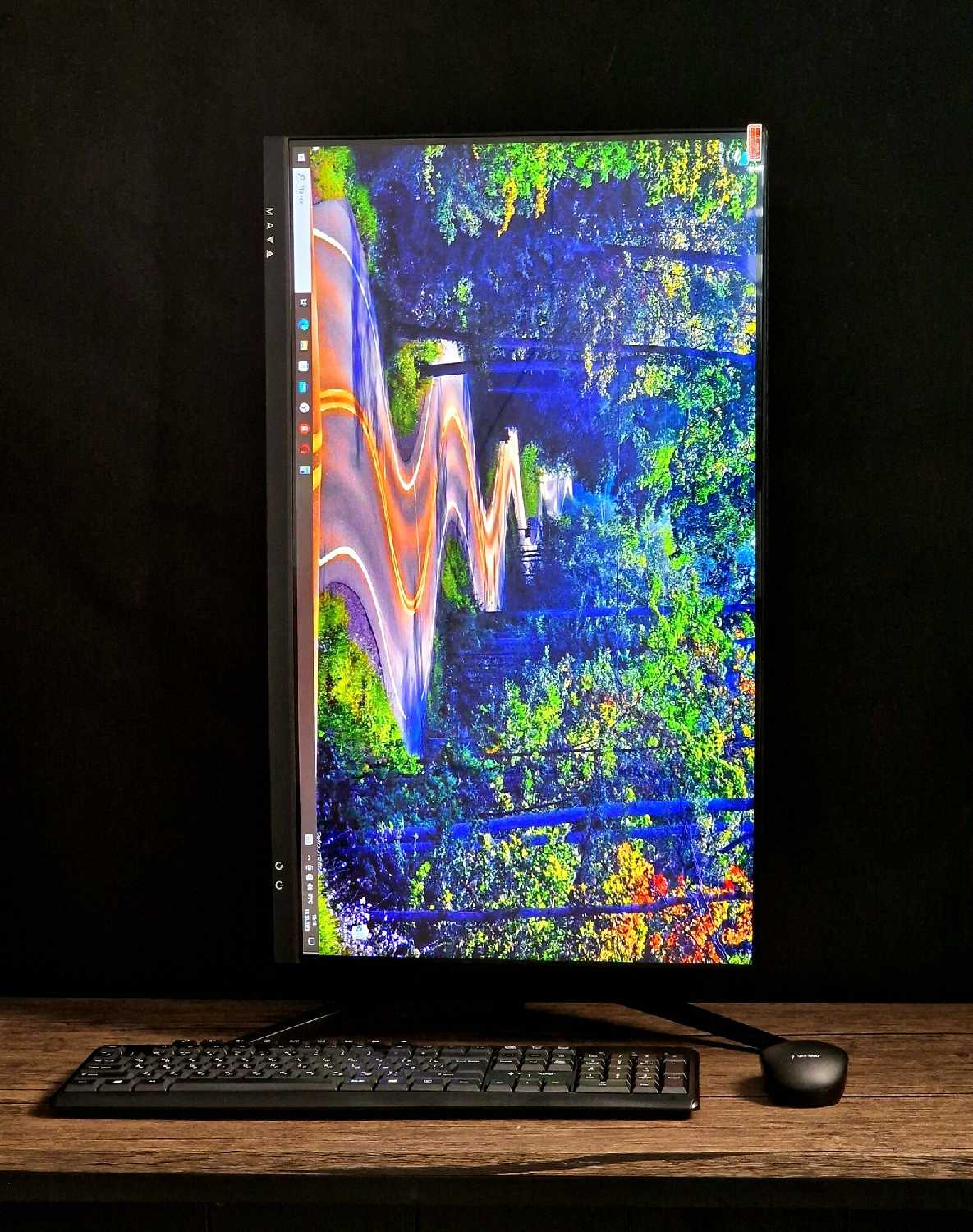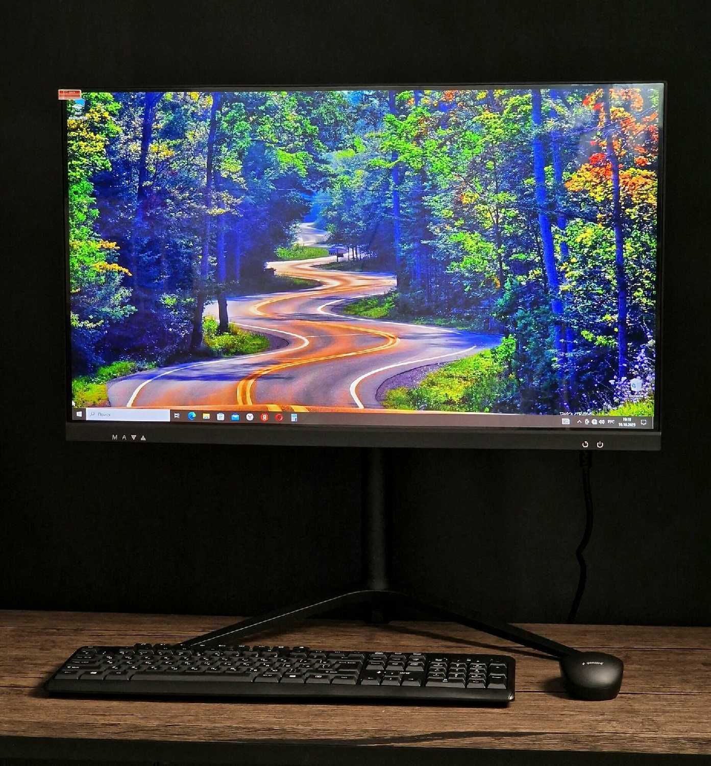 Большая диагональ экрана удобна, картинка яркая с хорошей цветопередачей, матовая матрица не бликует. Есть черная окантовка по периметру и небольшая щель в нижней рамке у белого корпуса. Цвета можно настроить драйверами AMD для большего комфорта. Подходит для работы с графикой и фото. -