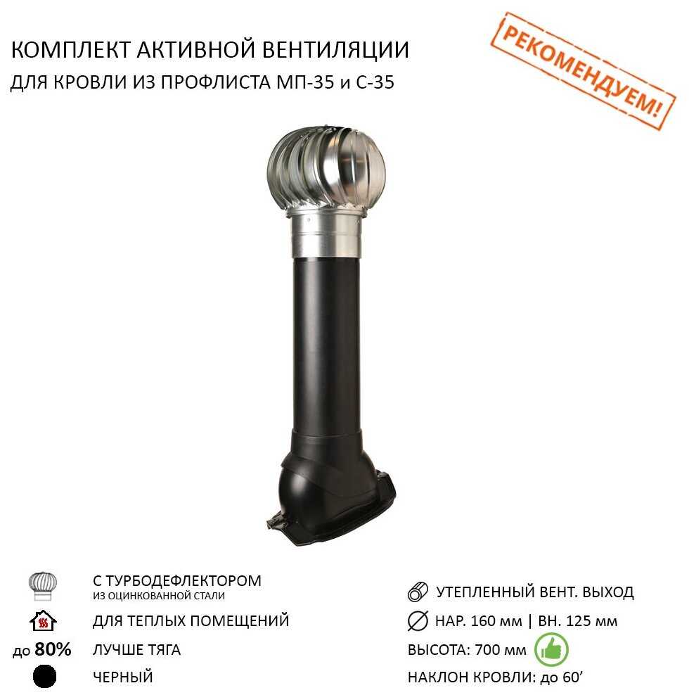 POLIVENT Комплект активной вентиляции: Турбодефлектор TD160 ОЦ, вент. выход утепленный высотой Н-700, для кровельного профнастила 35мм, черный