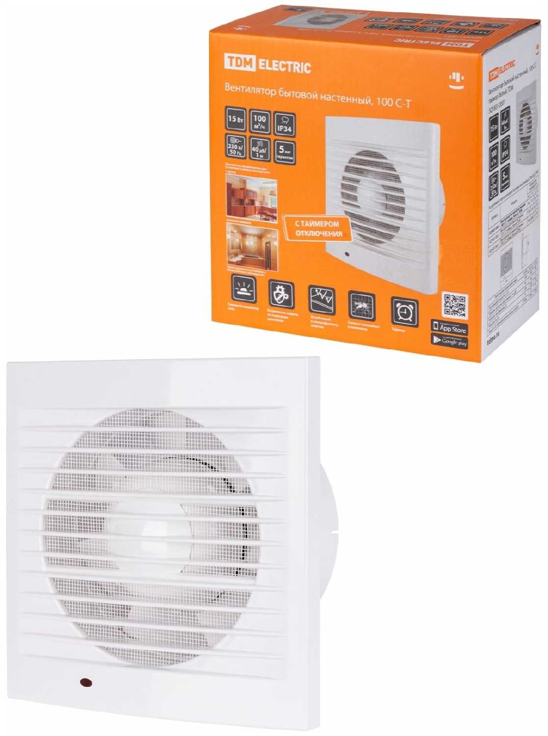 TDM ЕLECTRIC Вентилятор вытяжной бытовой настенный с таймером, установочный диаметр 100 мм, белый, IP34, 15Вт, 157х157х76 мм