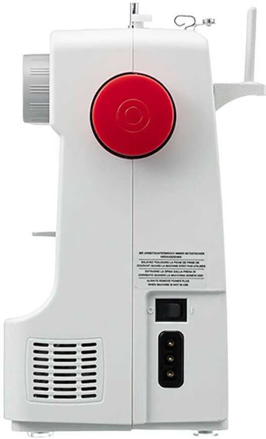 - + Достоинства: 20 видов стежков, кнопка реверса, недорогая, подходит для новичка, регулятор давления лапки, регулятор длины стежка, регулятор натяжения нити