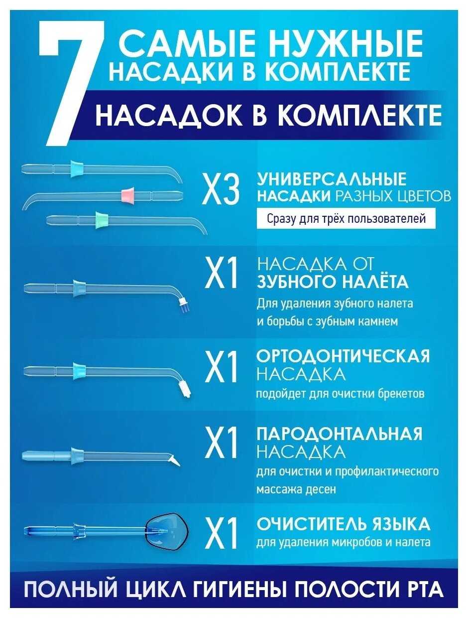 - В набор входят 7+ насадок: стандартные, для брекетов, пародонтологические, для языка, что расширяет функционал.