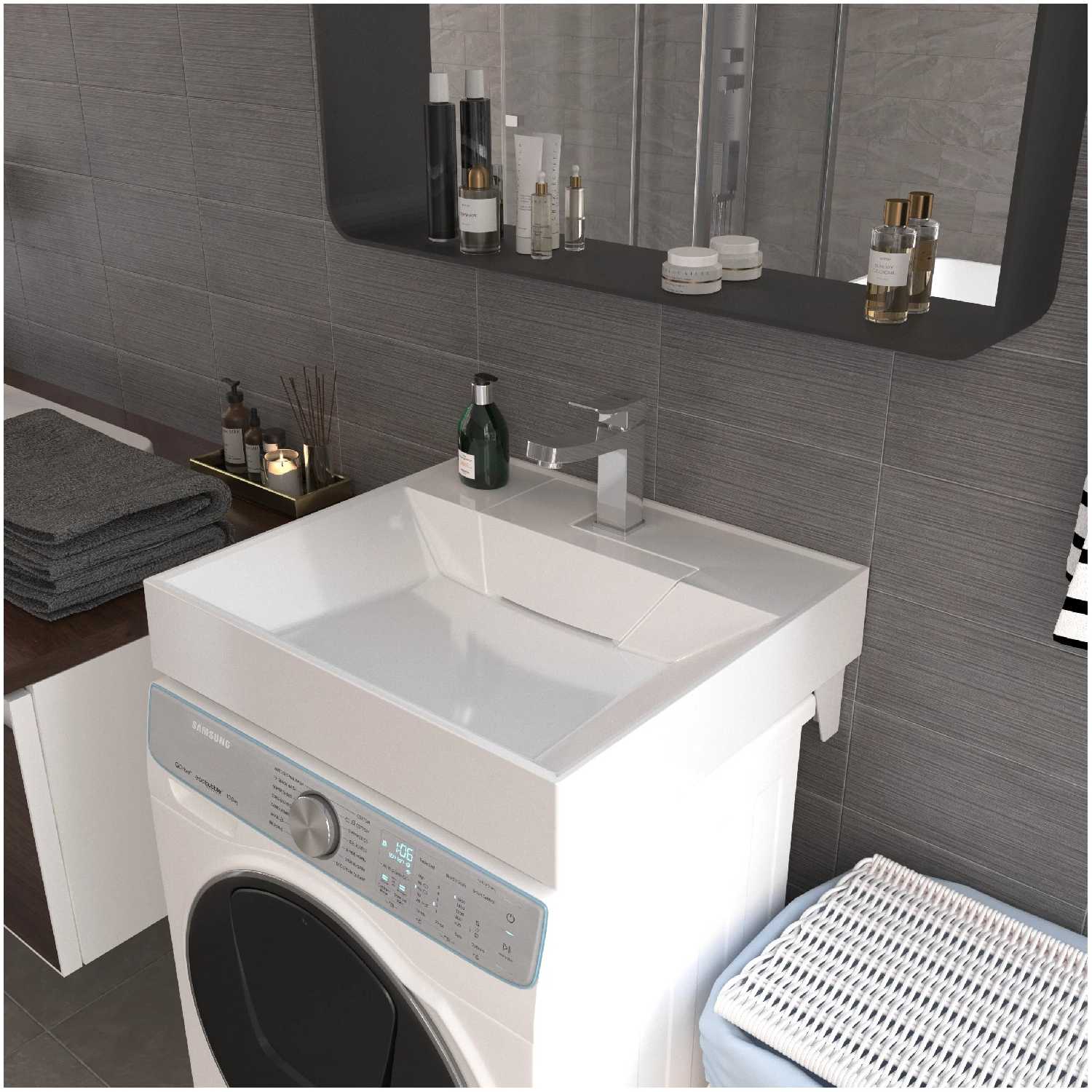 - + Раковина выглядит отлично, легко устанавливается. Компоновка удачная, пользоваться удобно, брызги не летят и есть место поставить принадлежности.