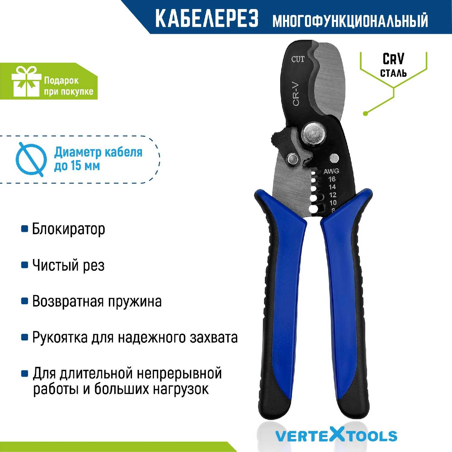 Отзывы о Кабелерез VertexTools Кабелерез многофункциональный для резки и зачистки проводов (185 мм)