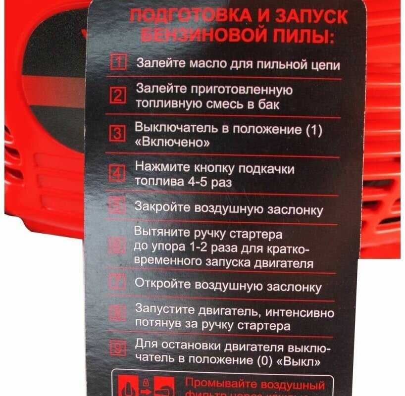 Комплект поставки : | Бензопила - 1 шт. Руководство по эксплуатации - 1 шт. Емкость для приготовления топливной смеси - 1 шт. Шина направляющая - 1 шт. Цепь пильная - 1 шт. Крышка шины - 1 шт. Отвертка - 1 шт. Ключ Г-образный шестигранный - 2 шт. Ключ свечной - 1 шт. Упор зубчатый - 1 шт. Винт - 2 шт. Напильник для заточки цепи - 1 шт. |