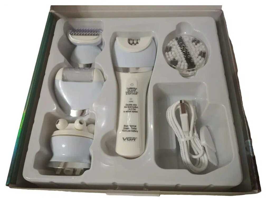 | Подробная комплектация : | инструмент для удаления волос, щетка для чистки, USB-кабель для передачи данных, защитный чехол, шлифовальная машина для ног, плавающая бритва, щетка для чистки лица, массажная головка для лица |