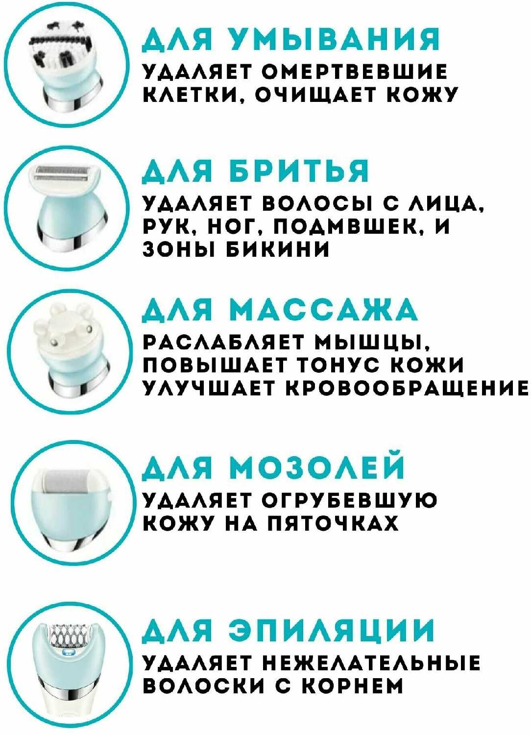 | Насадки : | для бритья, для педикюра, для пилинга, для точечного удаления волос, насадка для деликатных зон, насадка-ограничитель, насадка-триммер |