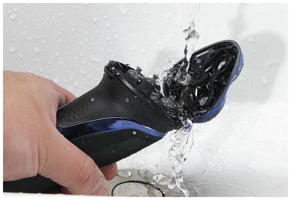 - Водонепроницаемый корпус (IPX7) позволяет использовать пену/гель и промывать ножи под струёй воды.