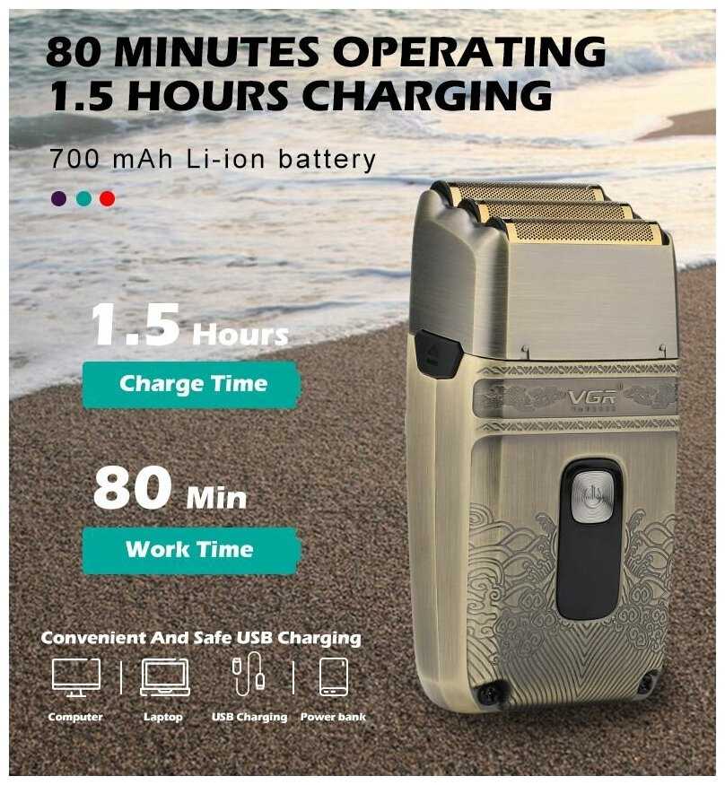 - Аккумулятор поддерживает 4–8 сеансов полного бритья головы и лица.