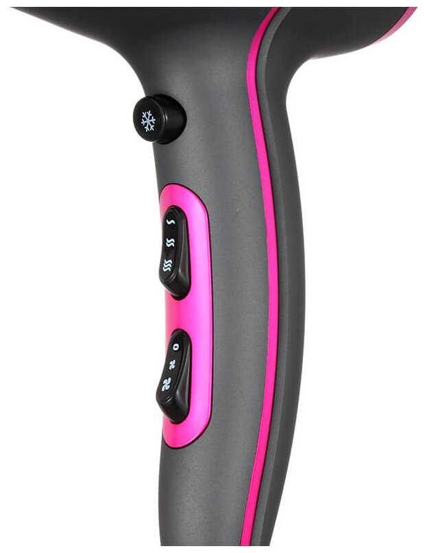 - Механический переключатель на корпусе адаптирует фен к разным сетям без дополнительных переходников.