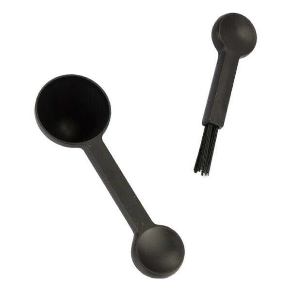 - В крышке бункера скрыты мерная ложка (дозировка 7-8 г) и щетка для чистки жерновов из натурального ворса.