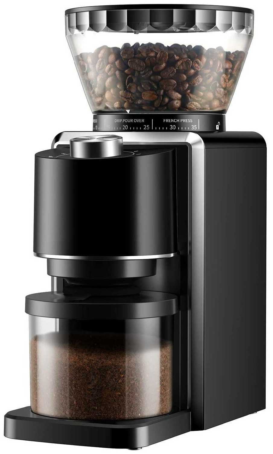 Установлены конические металлические жернова с продуманной конструкцией: подвижный нож имеет острые зазубрины у основания для эффективного дробления, а неподвижный плотно запрессован. Их соединение практически без люфтов дополнено резиновым уплотнением, что обеспечивает стабильность помола. Реальные конические жернова (а не псевдо или ротационные) предотвращают перегрев зерен, сохраняя аромат, и гарантируют долговечность при бытовом использовании. -