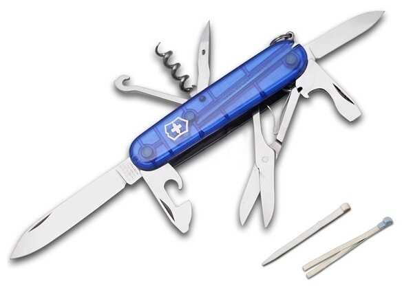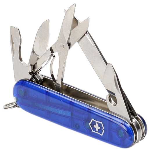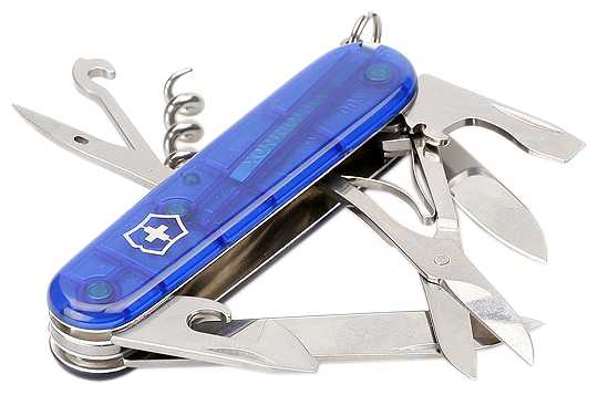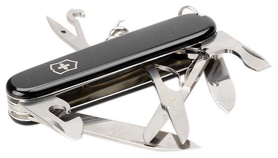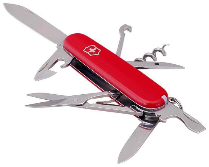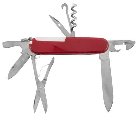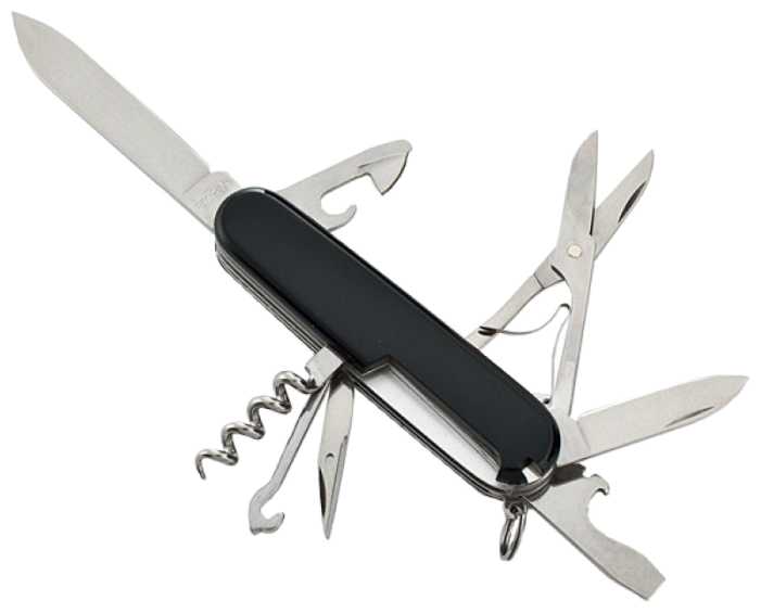 Инструменты (функции) : | большое лезвие малое лезвие штопор консервный нож малая отвертка (также для винта с крестообразным шлицем) открывалка для бутылок отвертка инструмент для снятия изоляции шило кольцо для ключей пинцет зубочистка ножницы многофункциональный крючок |