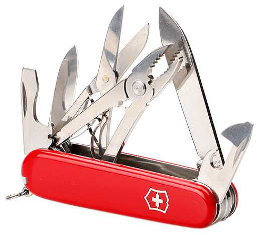 Инструменты (функции) : | большое лезвие малое лезвие крестовая отвертка консервный нож малая отвертка (также для винта с крестообразным шлицем) открывалка для бутылок отвертка инструмент для снятия изоляции шило кольцо для ключей пинцет зубочистка ножницы многофункциональный крюч |