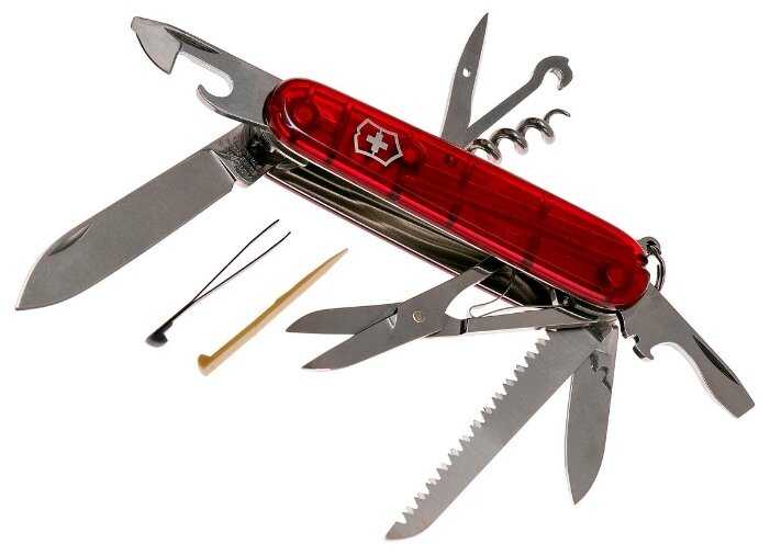 - + Моё первое знакомство с брендом VICTORINOX началось с покупки данного ножа серии HUNTSMAN. Долго выбирал и остановился именно на нём. Здесь представлено 15 функций есть: пила, нож, открывашки, штопор, шило, пинцет, зубочистка и всё это вместили в компактный размер 91 мм. Носить с собой данный нож можно каждый день, вес его позволяет положить в карман джинсов и он не будет обременять вас. Накладки пластиковые при частом использовании быстро получают чарапины, т.к. они глянцевые. Нож очень острый прямо с коробки, режет бумажки и пальцы на ура. Пила хоть и маленькая, но пилит она добротно даже сухую древесину. Нож подходит для походов и выездов на природу, благодаря ярким красным накладком его будет легко найти даже на земле или в траве если случайно его выронили. Ножом остался очень доволен. Всем рекомендую к покупке этого незаменимого помощника на каждый день. В своё время он стоил 1230 рублей, сейчас цена изменилась в разы на него. Приобретая данный нож советую сразу вязть чехол для него, чтоб он всегда оставался чистым и носить на ремне удобней нежели в кармане.