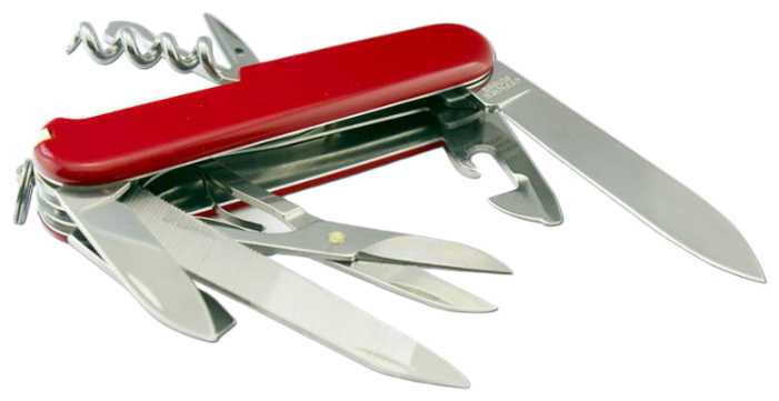 | Инструменты (функции) : | винтовая отвёртка, зубочистка, консервный нож, крючок, напильник, нож, ножницы, острогубцы, отвертка, открывалка для бутылок, пила, пилка для ногтей, пинцет, шило / кернер, штопор |