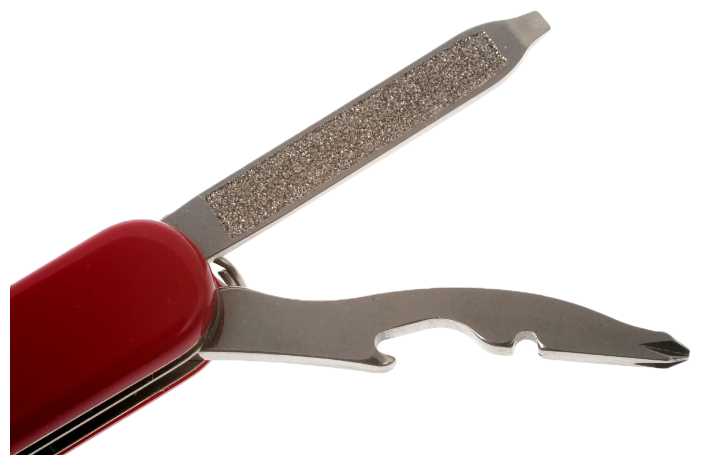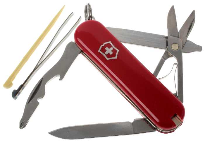 - Набор включает 10 инструментов: нож, ножницы, пилочку для ногтей с плоской отверткой, крестовую отвертку, открывалку для бутылок, пинцет, зубочистку и др.