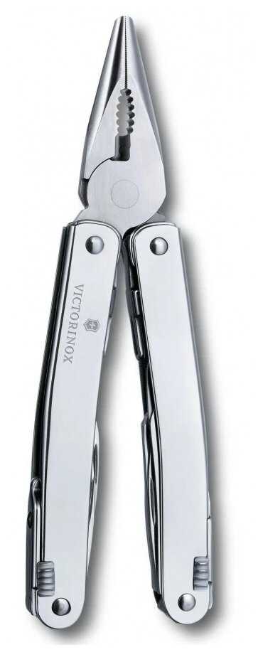 | Инструменты (функции) : | консервный нож, кусачки, линейка, напильник, нож, ножницы, острогубцы, отвертка, открывалка для бутылок, пассатижи, пила, плоскогубцы, сменные биты, шило / кернер, штопор |