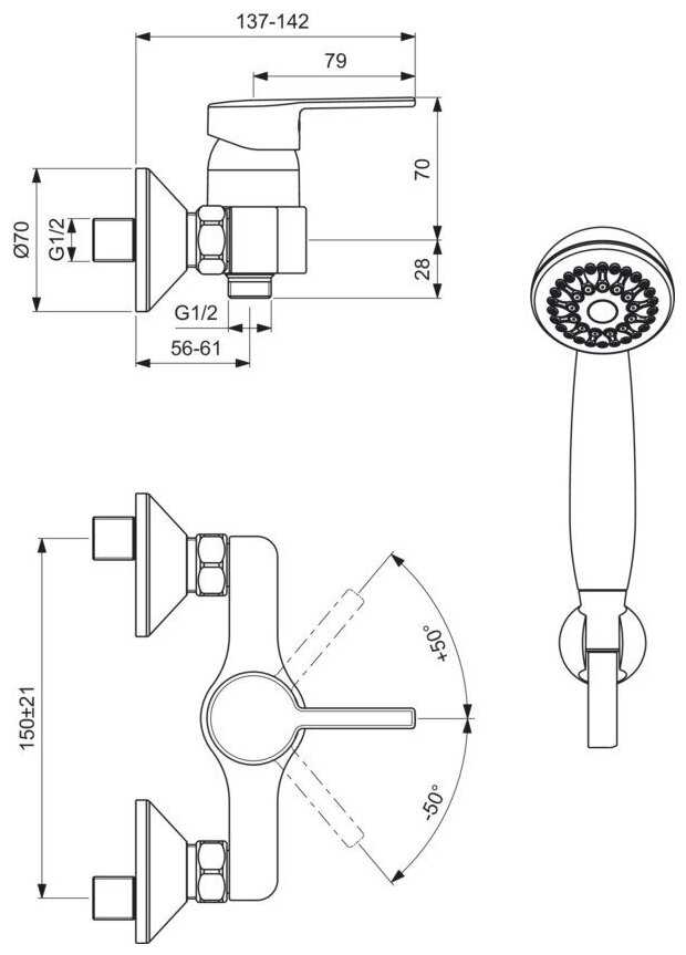 | Комплектация : | держатель лейки, ручной душ, смеситель, эксцентрик |