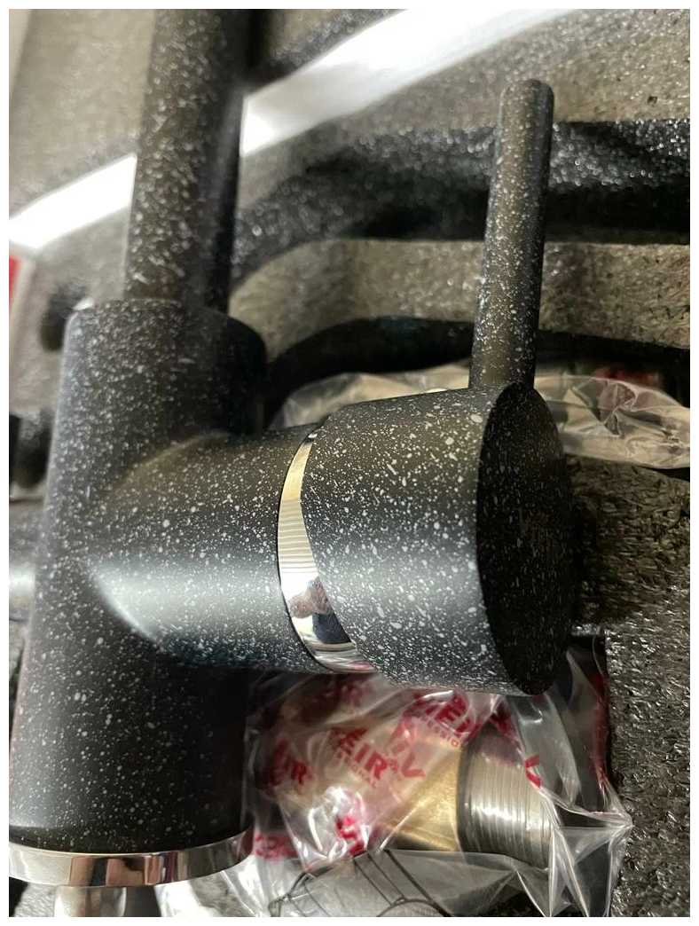 Ожидал, что он будет полностью черный. Но аэраторы и две детали в его основе цвета хром. По сравнению с другими смесителями, очень лёгкий. Точно не латунь. Посмотрим на сколько хватит