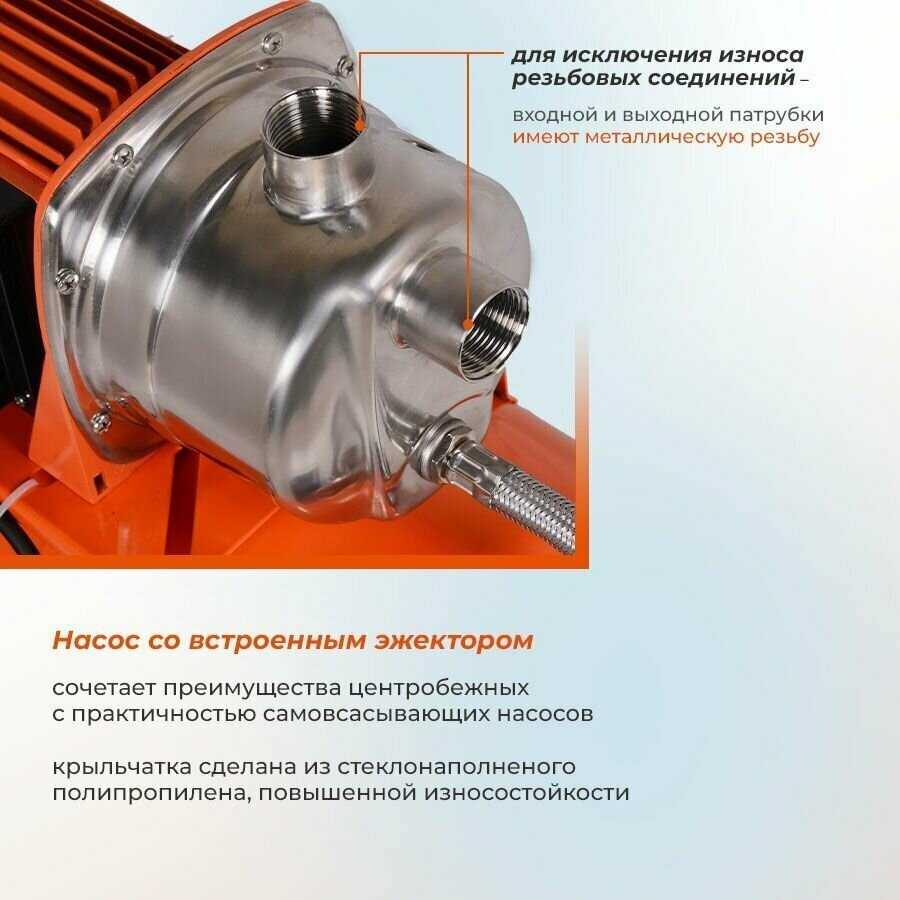| Дополнительная информация : | Преимущества Встроенный внутренний эжектор с системой труб Вентури позволяет перекачивать воду с меньшими, по сравнению с обычными центробежными насосами, требованиями к чистой воде и наличию в ней растворенных газов, а также обеспечивает функцию самовсасывания. Наличие тепловой защиты, при сбое с подачей воды или длительного использования на максимальной нагрузке защитная автоматика обесточит насос. Автоматическое включение и выключение станции. Наличие металлической резьбы на входном и выходном отверстиях. Специальные крепления насосной станции для дополнительной устойчивости. |