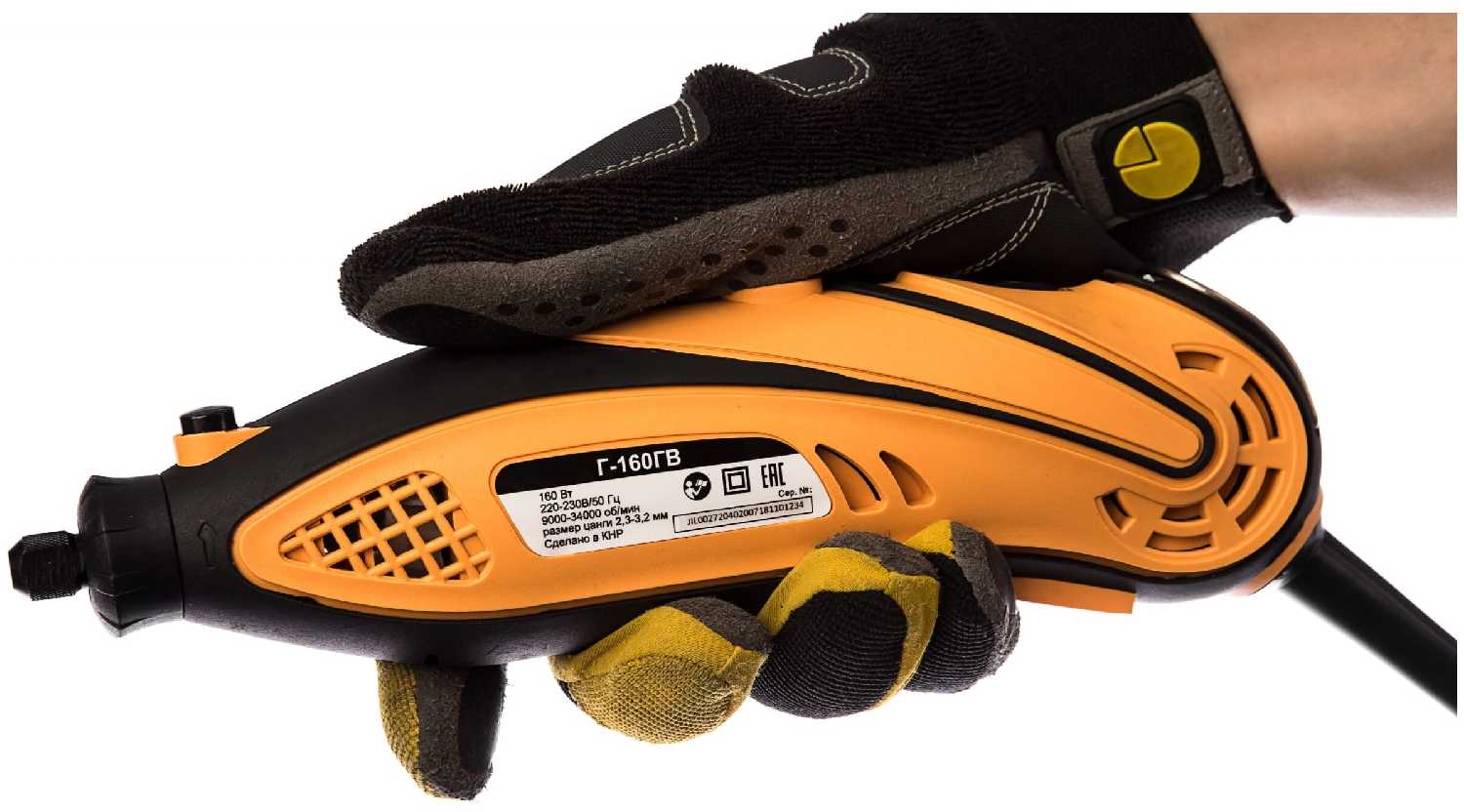 Регулятор скорости позволяет плавно менять обороты от 8 000 до 34 000 об/мин, что удобно для разных задач. Однако даже минимальная скорость достаточно высока для тонкой гравировки, а при нагрузке (например, надавливании насадкой) двигатель может терять обороты. Мощности 160 Вт хватает для работы с деревом, пластиком и мягкими металлами, но для твердых материалов лучше использовать специализированные насадки. -
