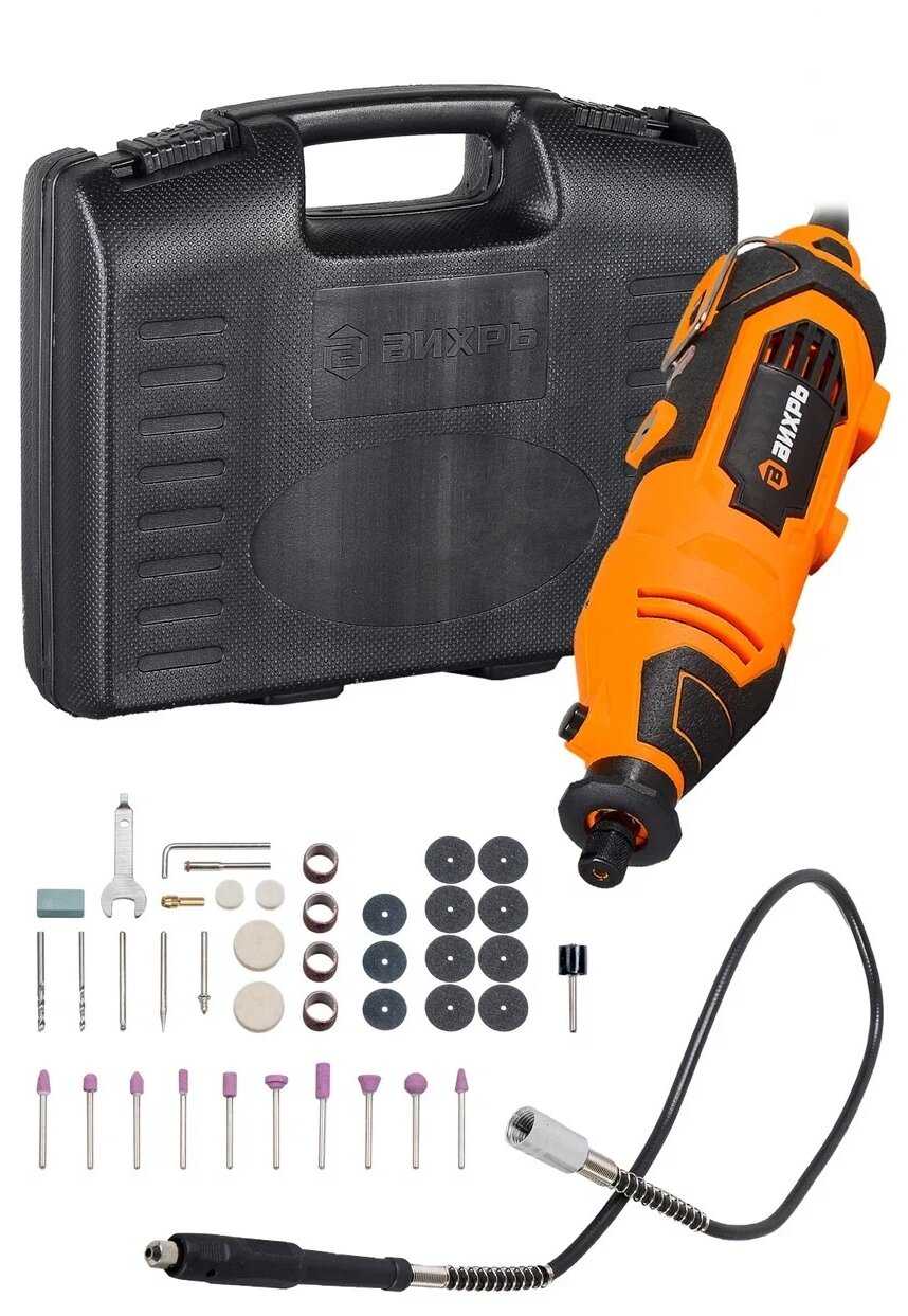 - Включает кейс для хранения, гибкий вал и 38 насадок различных типов.