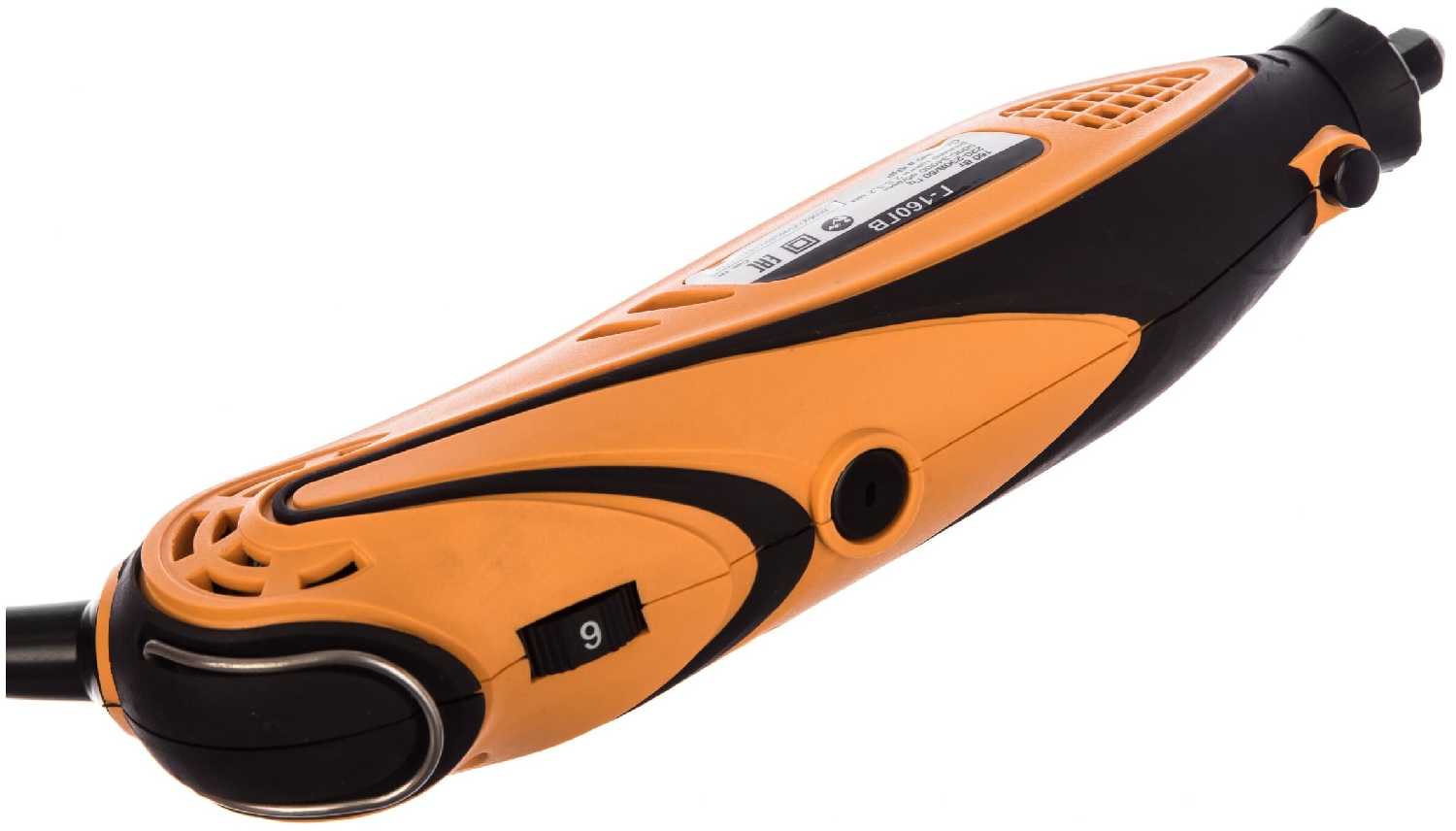 Регулятор скорости позволяет плавно менять обороты от 8 000 до 34 000 об/мин, что удобно для разных задач. Однако даже минимальная скорость достаточно высока для тонкой гравировки, а при нагрузке (например, надавливании насадкой) двигатель может терять обороты. Мощности 160 Вт хватает для работы с деревом, пластиком и мягкими металлами, но для твердых материалов лучше использовать специализированные насадки. -
