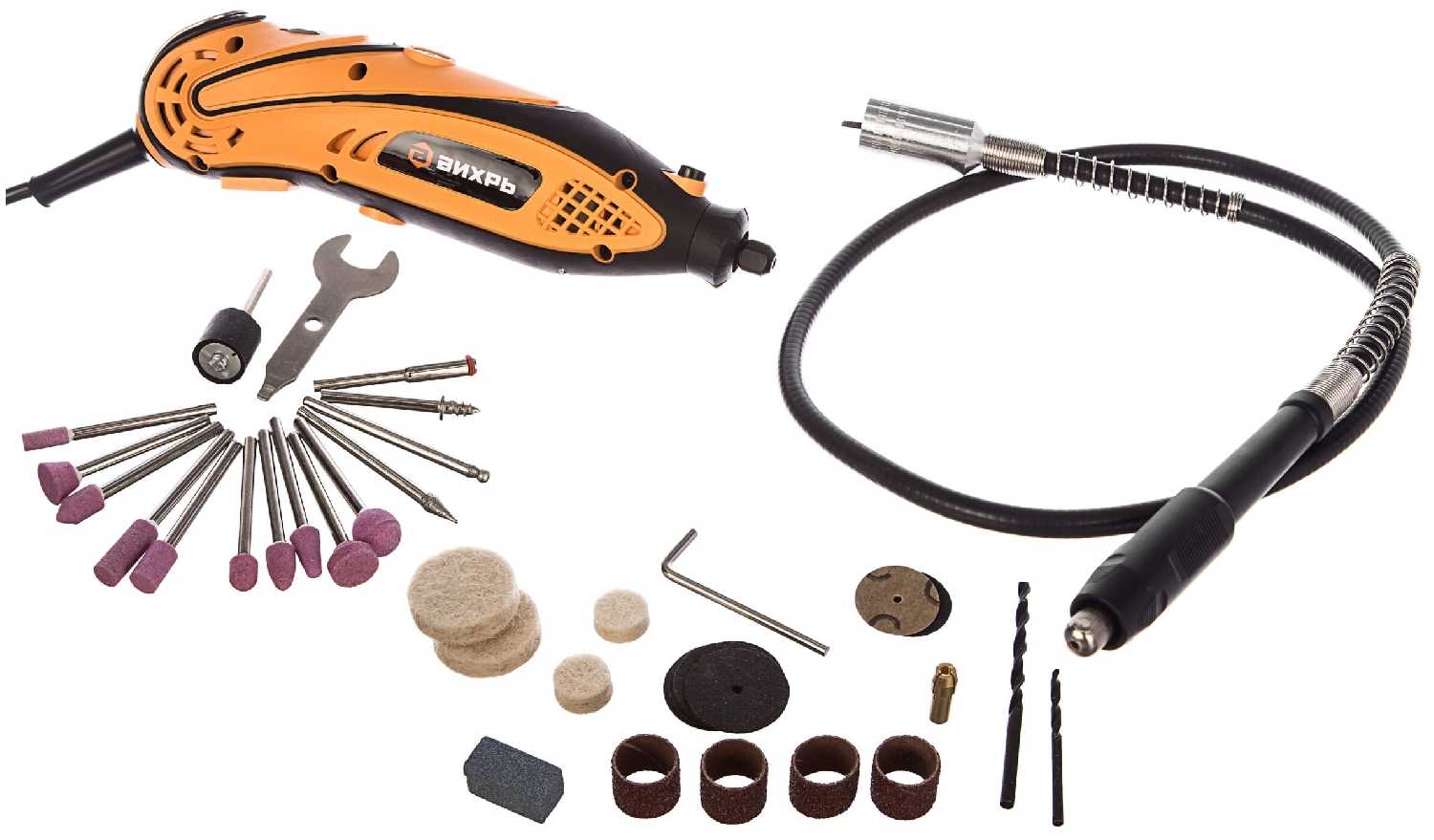 Цена, кейс, гибкий вал и какой-то минималистичный набор насадок в комплекте. Регулировка оборотов.