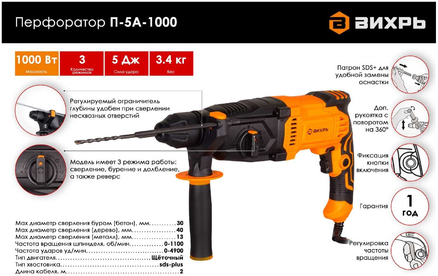 Отзывы о Перфоратор ВИХРЬ П-5А-1000 (72/3/11)