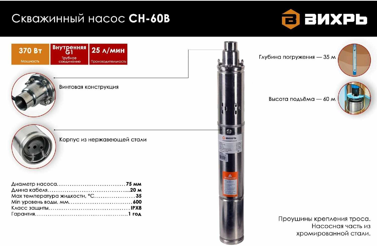 Насос эффективно работает на глубинах до 40–60 метров, однако его производительность существенно снижается с увеличением глубины погружения. Например, при подъеме с 42 метров реальный расход составляет около 11 л/мин вместо заявленных 25 л/мин. Для стабильной работы на больших глубинах критически важно предварительно изучать напорно-расходную характеристику конкретной модели в паспорте, так как фактические показатели зависят от гидрогеологических условий. -