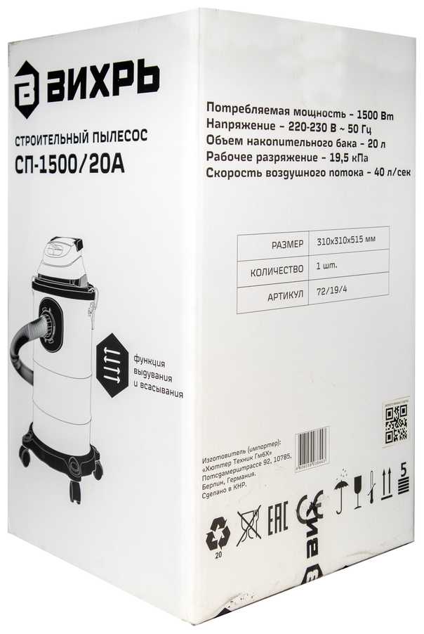 Отзывы о Профессиональный пылесос ВИХРЬ СП-1500/20А, 1500 Вт