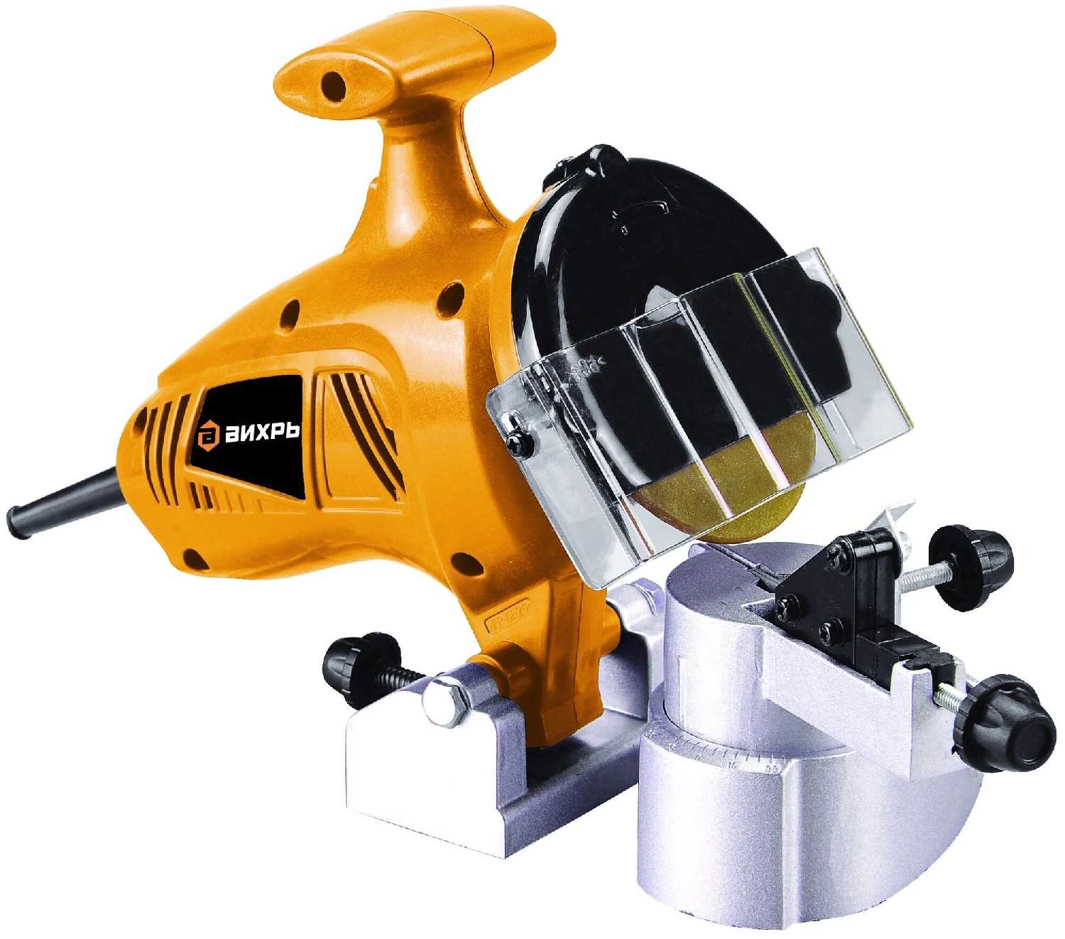 Регулировка угла от 0 до 30°, наклона диска и шага цепи занимает 5-10 минут с помощью винтов, процесс осваивается за 1-2 цепи по инструкции или видео на YouTube. Компактный (вес 2 кг), легко крепится резиновыми ножками на верстак без болтов, не опрокидывается благодаря литой станине. Защитный прозрачный экран блокирует искры, но затирается быстро; многие добавляют освещение для точности. Короткий шнур 50 см вынуждает использовать удлинитель, а рукоятка каретки расположена близко к цепи, рискуя порезами рук.