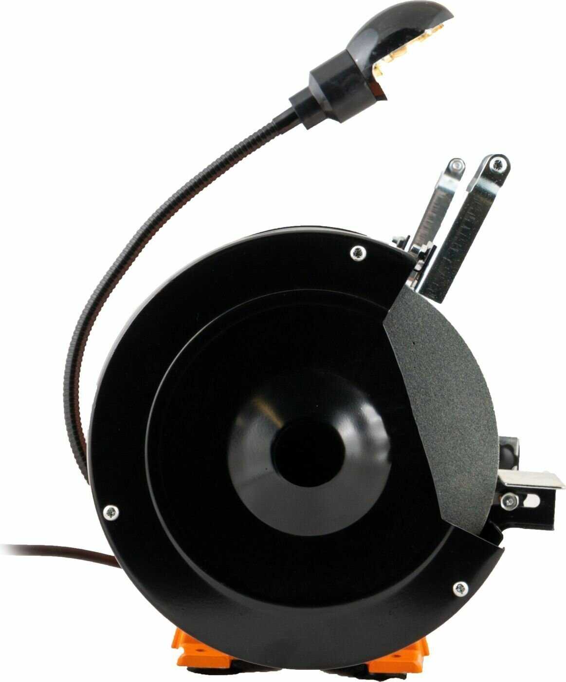 Лампа на гибкой штанге — ключевое преимущество: она освещает зону контакта инструмента с кругом, что критично при работе в гараже или вечером. Однако 25% пользователей считают её недостаточно яркой. Важно проверить подключение — иногда не замечают отдельный выключатель на проводе лампы. -