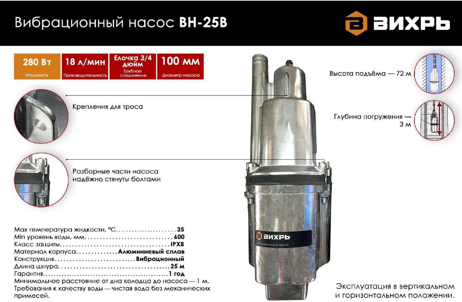 Преимущество перед поверхностными насосами — способность работать на больших глубинах (свыше 7 м) без потери напора. Среди вибрационных аналогов выделяется повышенной мощностью (280 Вт) и длинным кабелем (25 м против стандартных 10–15 м). Алюминиевый корпус обеспечивает преимущество в весе и антикоррозийной стойкости перед стальными моделями, но уступает им в ударопрочности. Для артезианских скважин или систем с постоянным высоким давлением рекомендуются центробежные насосы, тогда как данная модель оптимальна для сезонного использования на даче.
