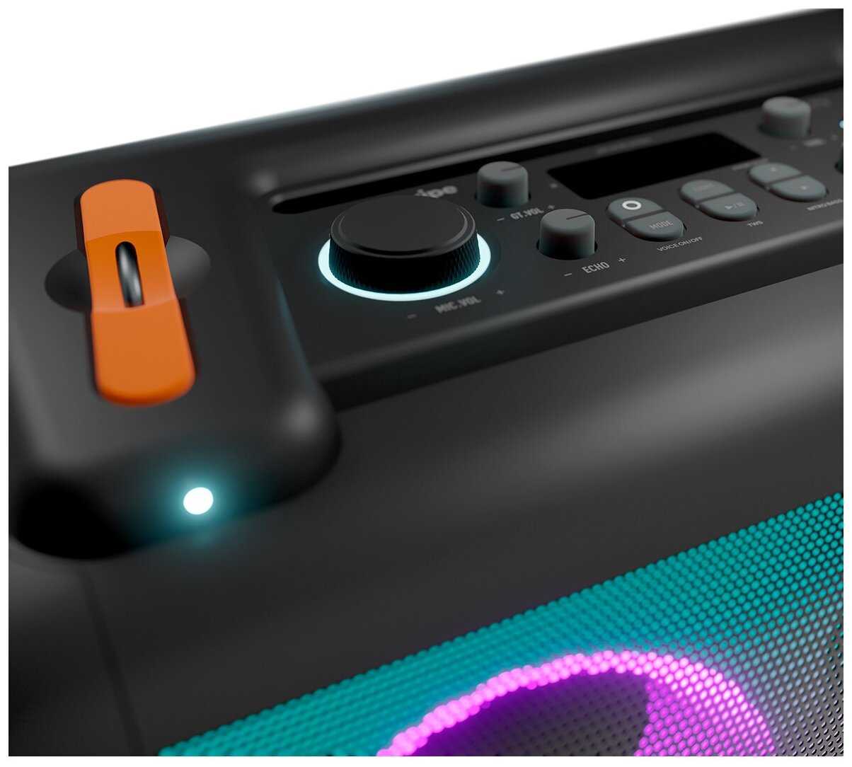 Для караоке колонка подходит условно. Есть отдельный разъем 6.3 мм для микрофона, но регулировка его громкости осуществляется не напрямую, а через комбинацию кнопок, что неудобно. Пользователи отмечают, что звук микрофона может искажаться, становясь «глухим, как из бочки». При подключении микрофона система автоматически приглушает фоновую музыку, и отключить эту функцию невозможно. -