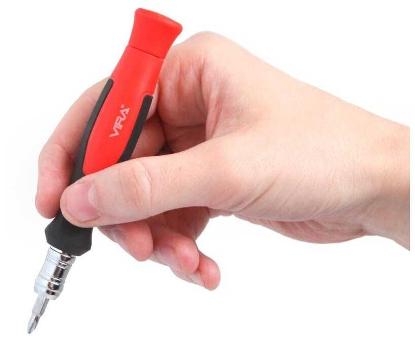 - Вращающийся кончик позволяет крутить без нажима ладонью, полезно для мелких винтов.