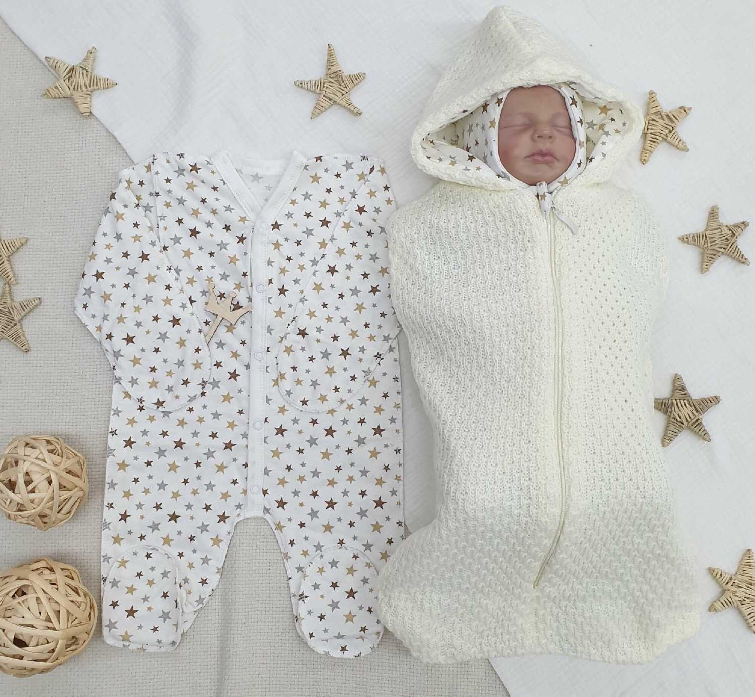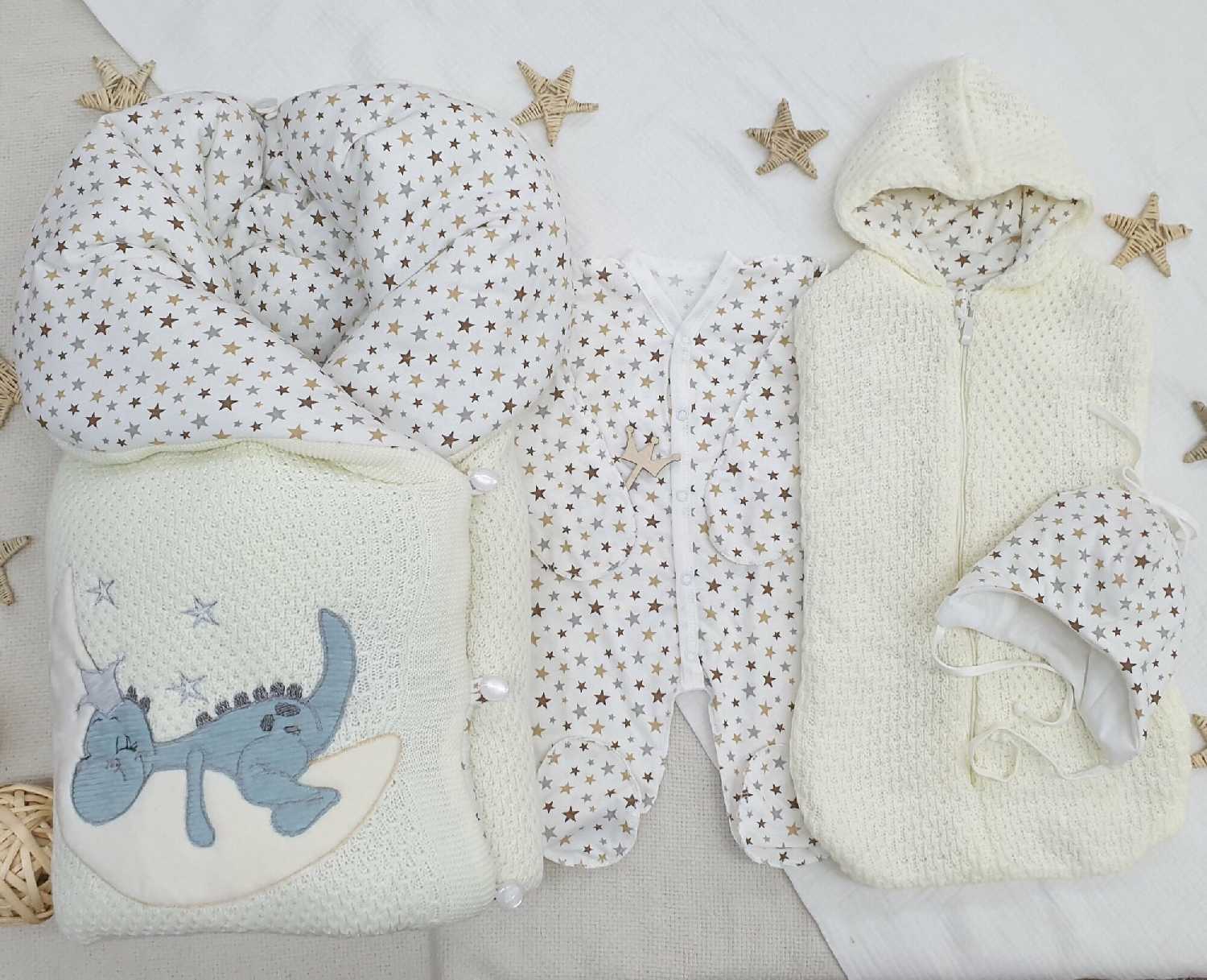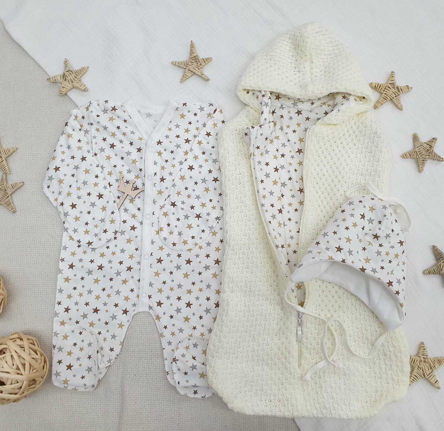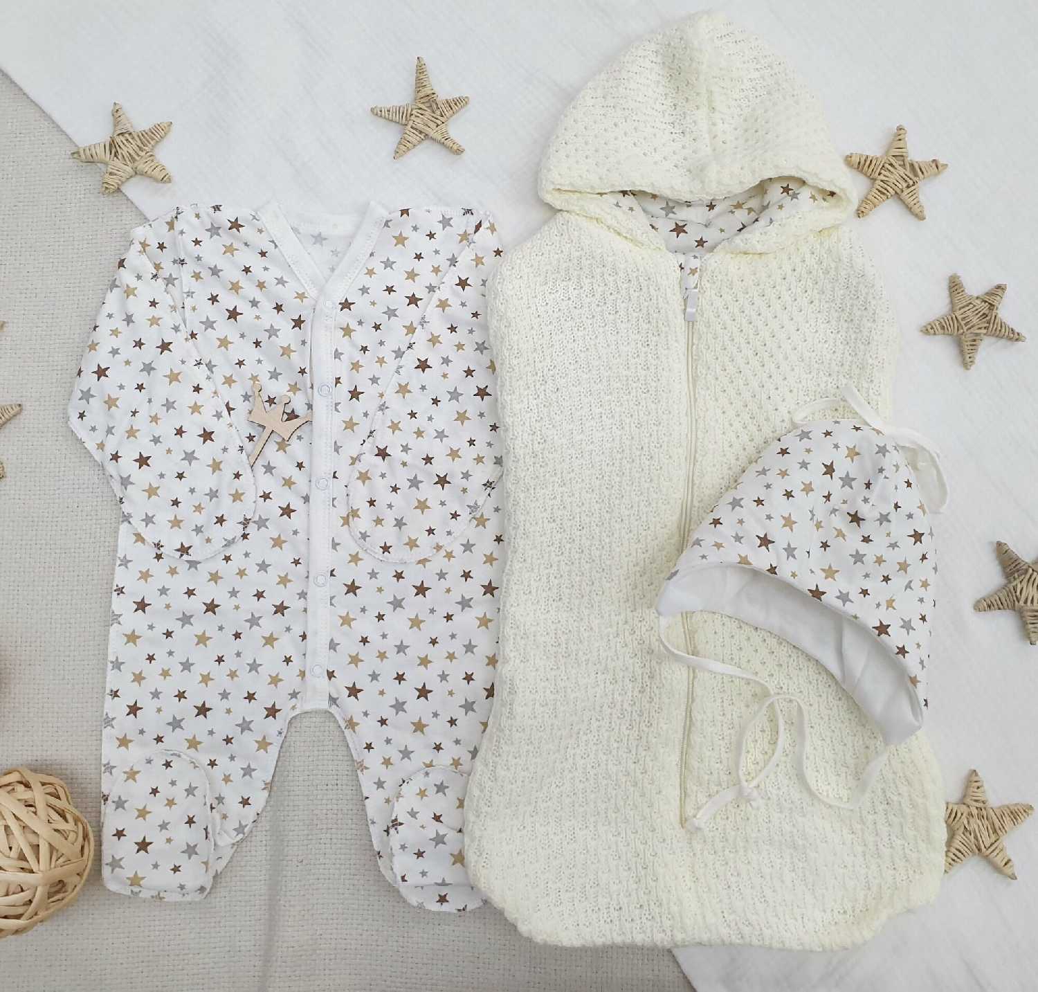 Комплектация : | Одеяло-конверт на пуговицах, комбинезон 100% хлопок, кокон-пеленка на молнии, шапочка хлопок 100% |