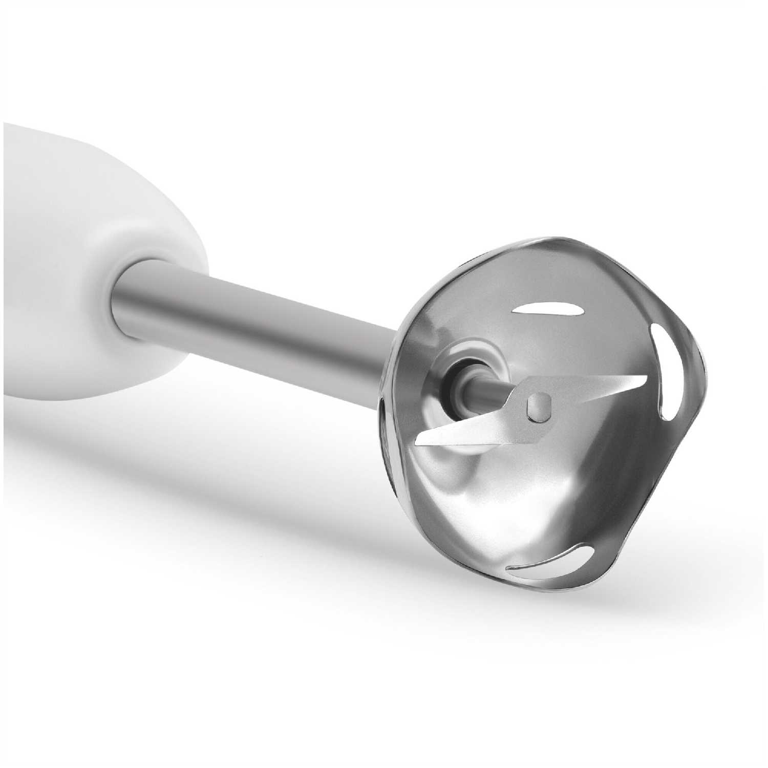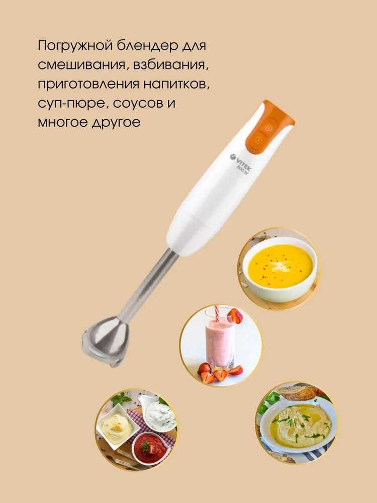 - + Легкий блендер, корпус белый с оранжевой вставкой, свежо смотрится. Все погружная часть и ножи из нержавейки. Ножи острые.