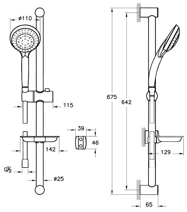 | Дополнительная информация : | высота стойки для душа: 675 мм, диаметр душевой лейки: 110 мм |