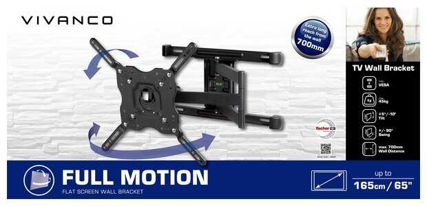 - + 1. Вылет от стены 70 см. Правда учитывайте, что это именно от стены и до отодвинутого параллельно стене ТВ. При повороте на 90° (перпендикулярно стене) за счет толщины крепления к стене и узла поворота остается около 62 см, Телек 55 дюймов можно повернуть точно перпендикулярно стене прям впритык, 65 (или какой-нибудь старый 55 с толстыми рамками) уже точно нет.