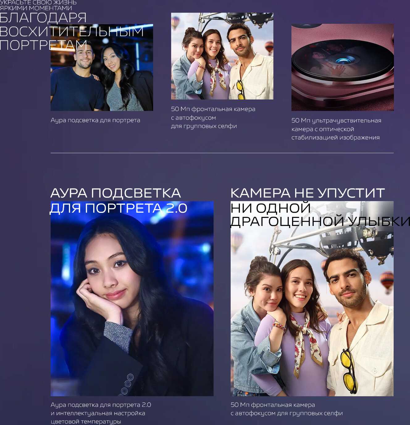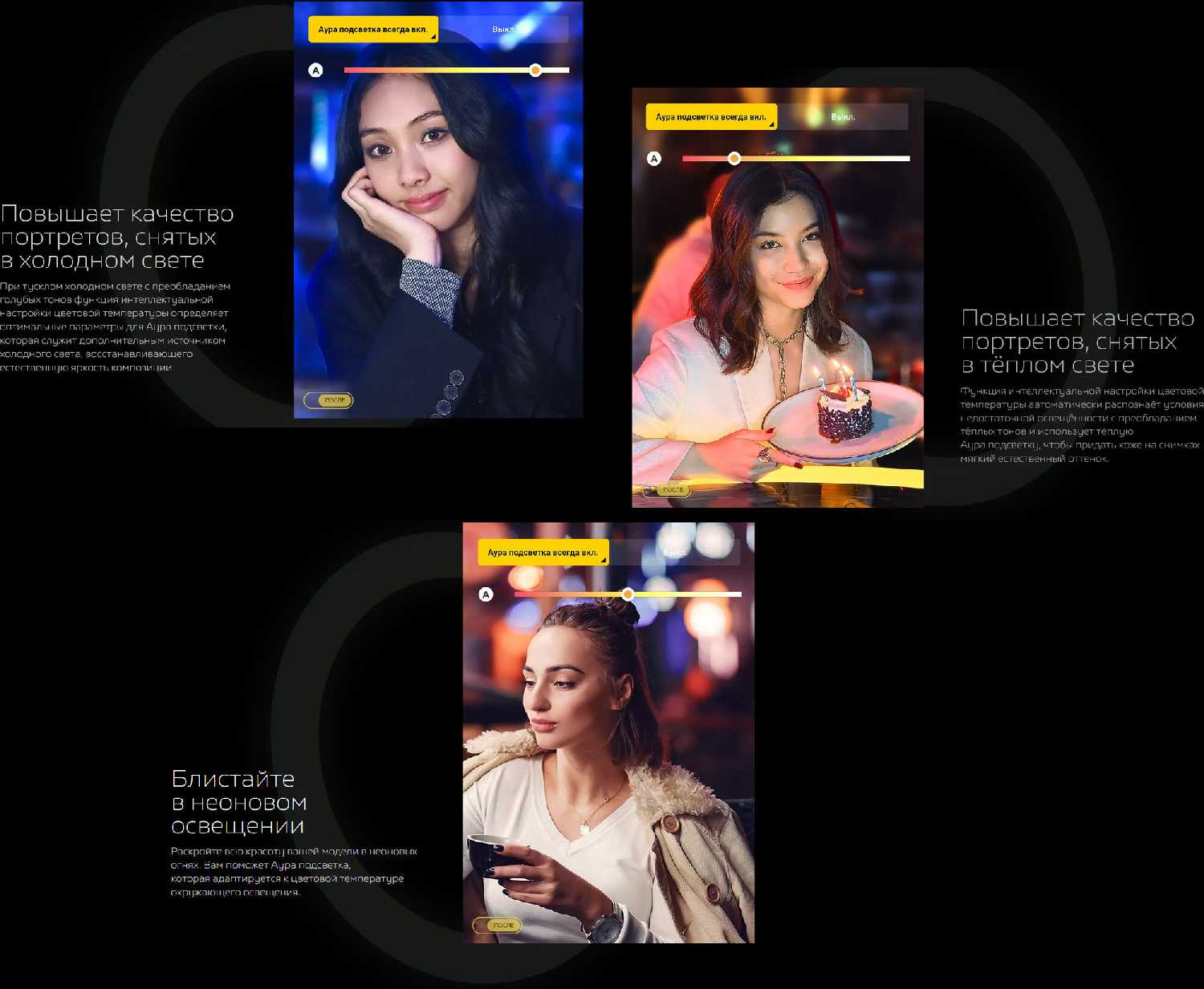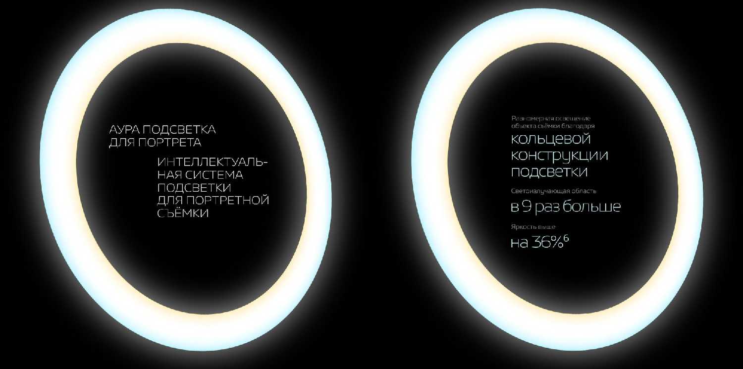 - Оптическая стабилизация и режим «Аура-подсветка» устраняют шумы и улучшают цветопередачу в портретных снимках.